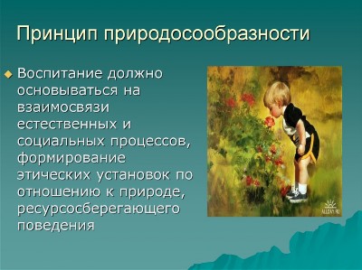 природосообразности воспитания, подразумевающий понимание врожденных черт ребенка, учет его возрастных и индивидуальных особенностей;